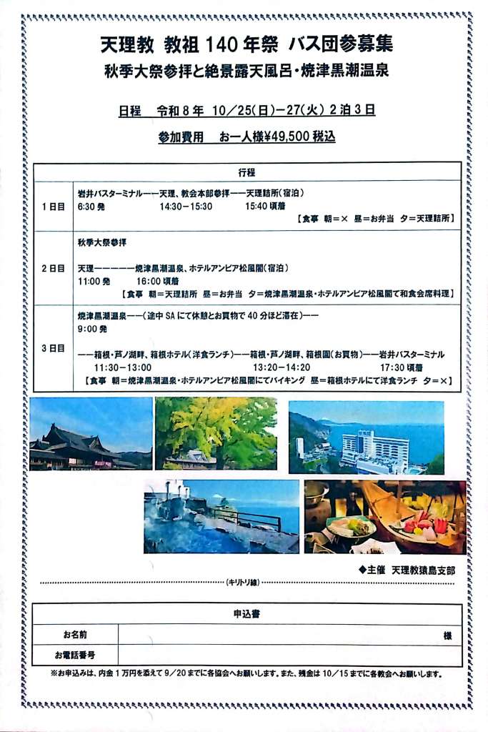 さしま支部では一人でも多くの方々に「おぢばがえり」をして頂きたいとの思いから、バス団参を企画しています。物価高の社会の中、支部内の会長並びに教会関係者が、東奔西走し、創意工夫を凝らした団参の内容でございます。ぜひともご参加ください。令和7年の内容を一部変更しまして、より良い企画になっております。日時、金額の変更はございません。