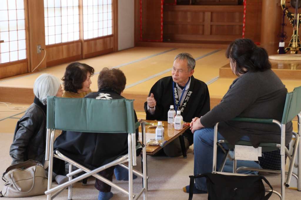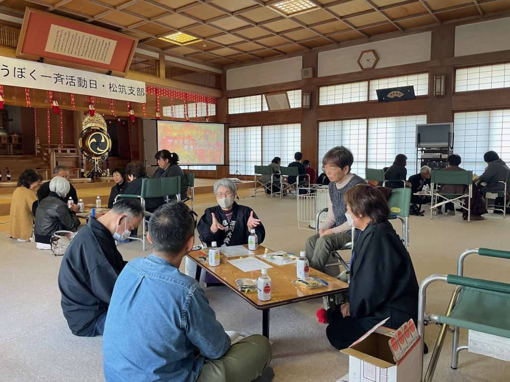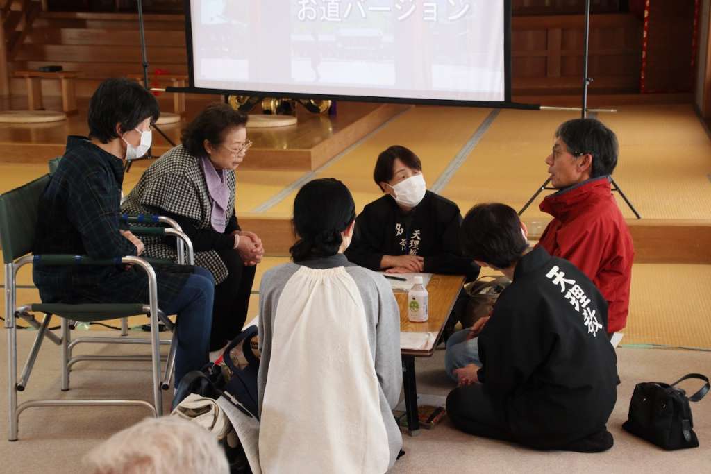教祖140年祭へあと3ヵ月となるなか、本部からのビデオメッセージに続き、第2回の一斉活動日で好評だったねりあいを茶話会・サイコロトーク形式で、5,6名のグループに分かれて行いました。各グループとも徐々に打ち解け、笑顔の見られる中、信仰談義が活発に行われました。