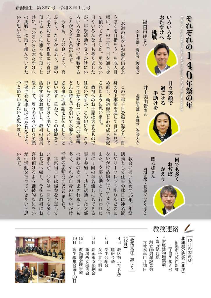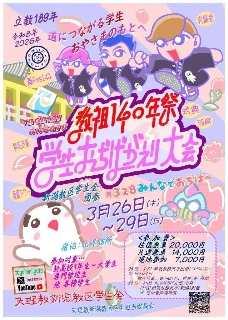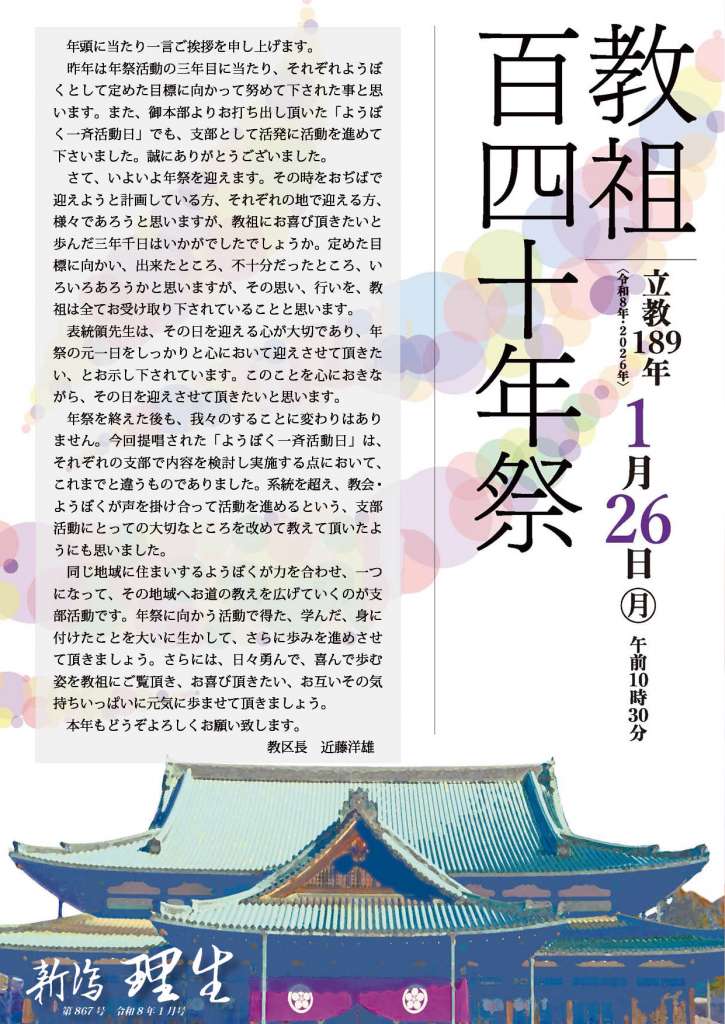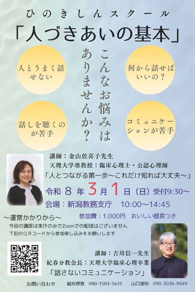 掲示板 本部で回廊ひのきしんを! 2025年10月20日 (月) 学生おぢばがえり大会のご案内 2026年01月23日 (金) 青年会の雅楽講習会のご案内 2026年01月23日 (金) ひのきしんスクールのご案内 2026年01月23日 (金) 新潟理生1月号 2026年01月23日 (金)