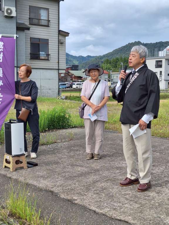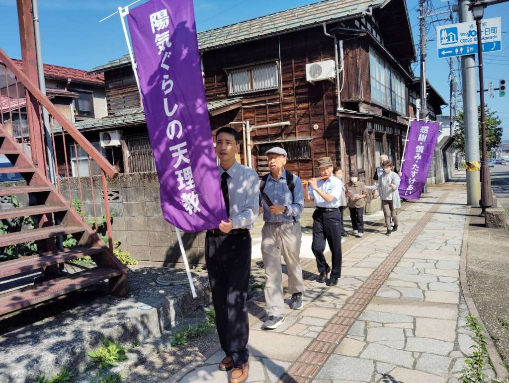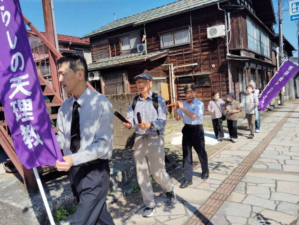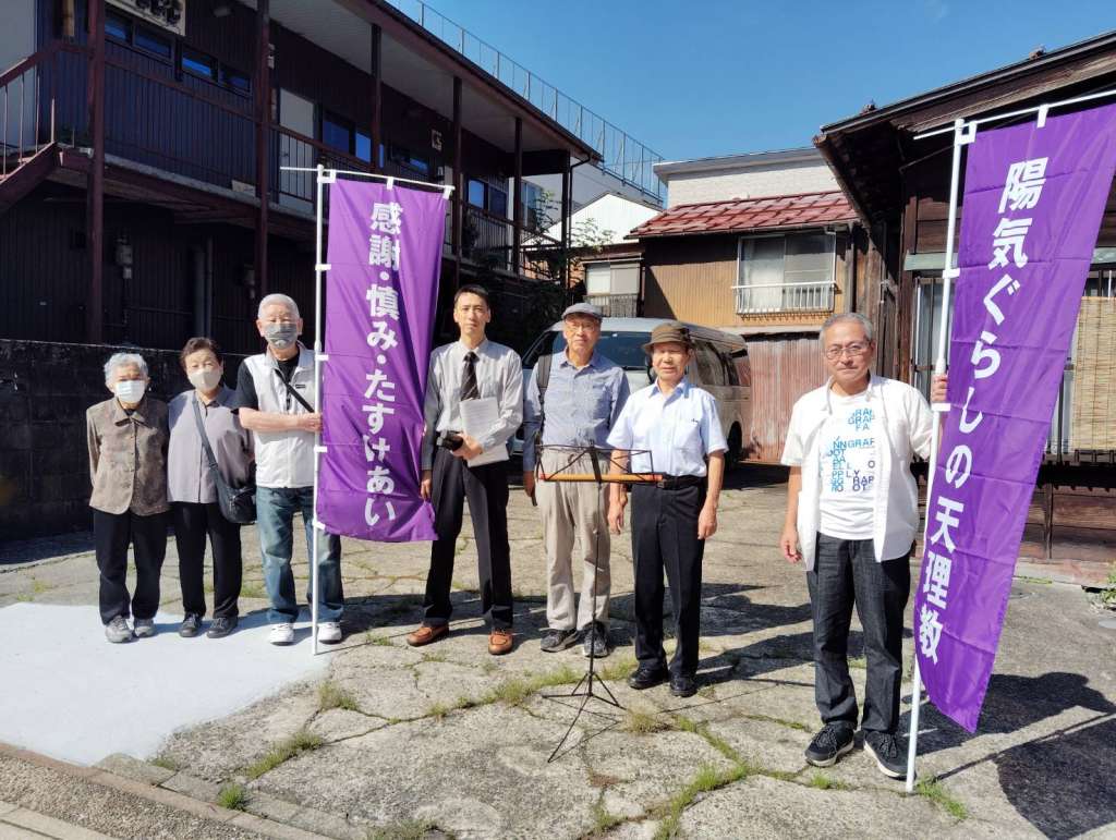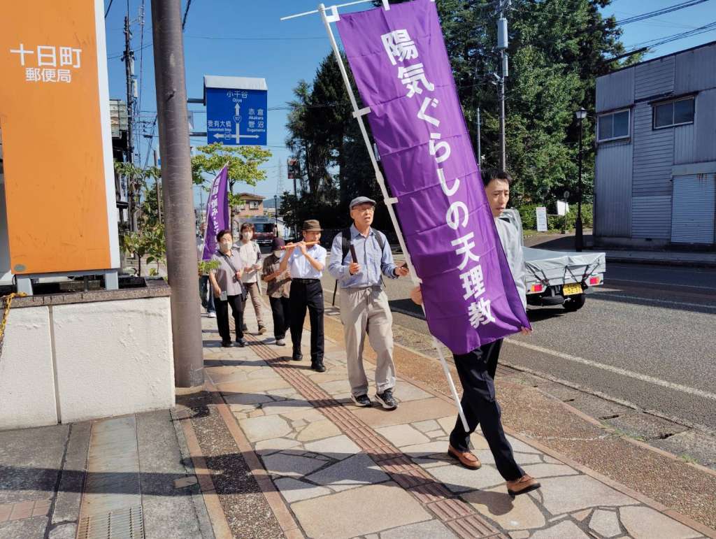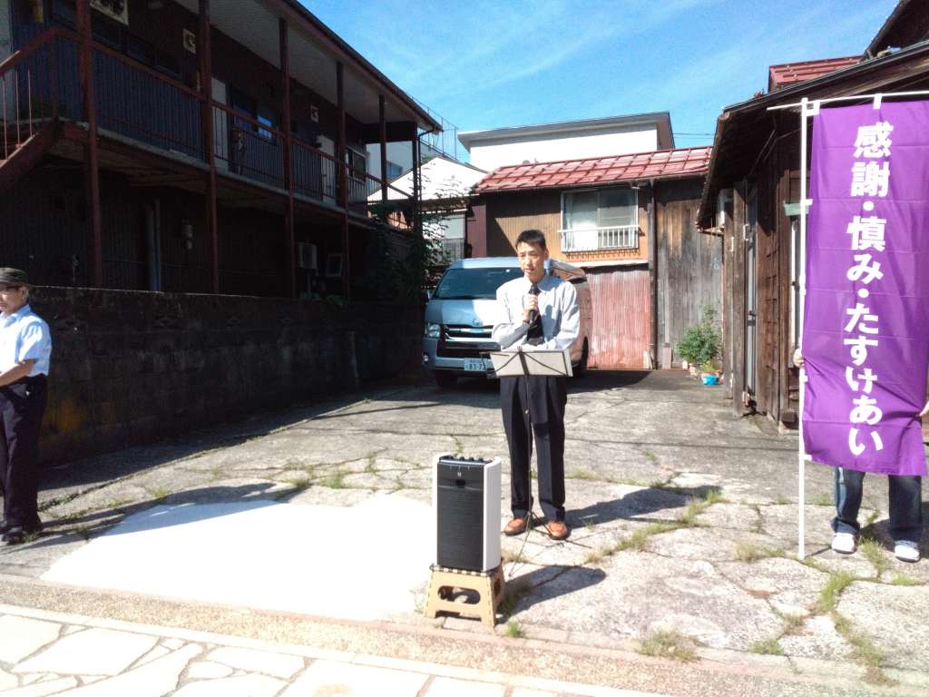 北越分教会信者会館駐車場で路傍講演、リーフレット配り