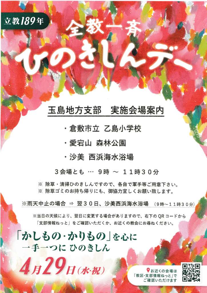 玉島地方支部 掲示板 全教一斉ひのきしんデー 玉島地方支部 ご案内 2026年03月20日 (金) 【玉島地方支部】 立教189年 全教一斉ひのきしんデー 4月29日(水・祝)・倉敷市立乙島小学校・愛宕山森林公園・沙美西浜海水浴場3会場とも・・・9時~11時30分※除草・清掃ひのきしんですので、各自で軍手等をご用意下さい。※除草ゴミのお持ち帰りにも、ご協力宜しくお願い致します。※雨天中止の場合 ⇒ 翌30日、沙美西浜海水浴場(9時~11時30分) Tweet < 前の記事 OLD掲示板のご案内