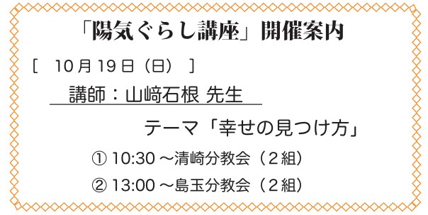 5月24日(土)、吹田分教会(午前)、朝陽分教会(午後)を会場に、陽気ぐらし講座が開催された。当日は雨天にもかかわらず、両会場で34名(うち未信仰の方12名)の方が参加された。