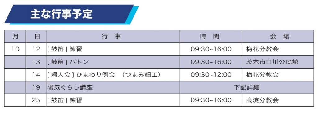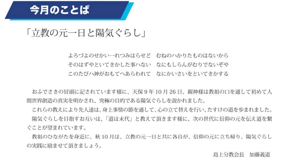 会場を一か所に定めて、支部内全ようぼくにお集まりいただき、年祭に向け、 決起と親睦を図りたいと思っております。