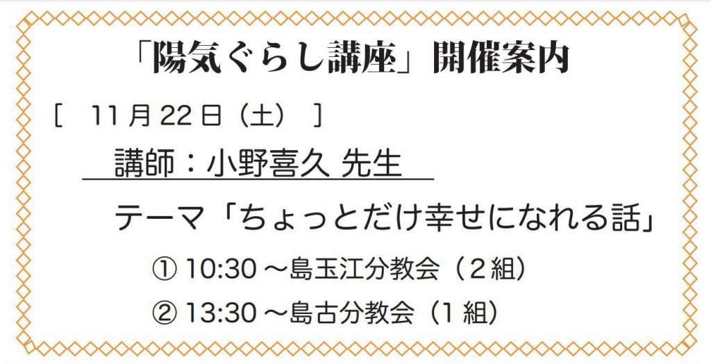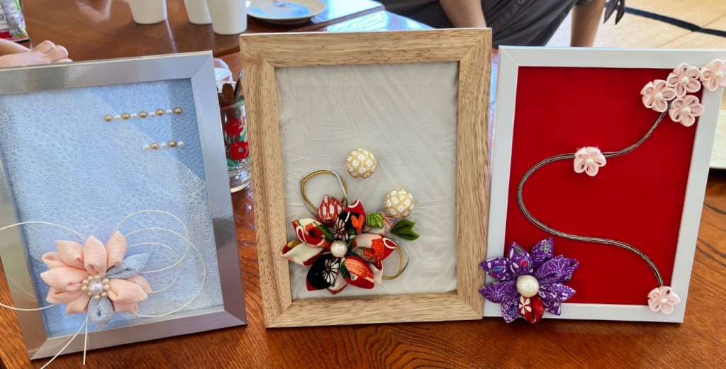 10月14日には、梅花分教会前で神名流しをさせていただき、その後、つまみ細工でフレーム飾りを作りました。楽しくおしゃべりしながら思い思いに作った飾りに皆満足でした。参加者は大人4人、子供2人でした。