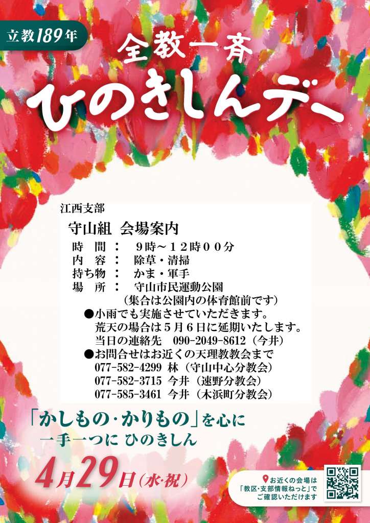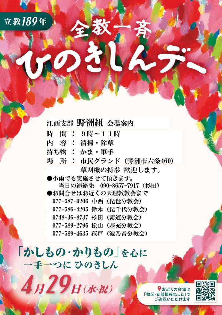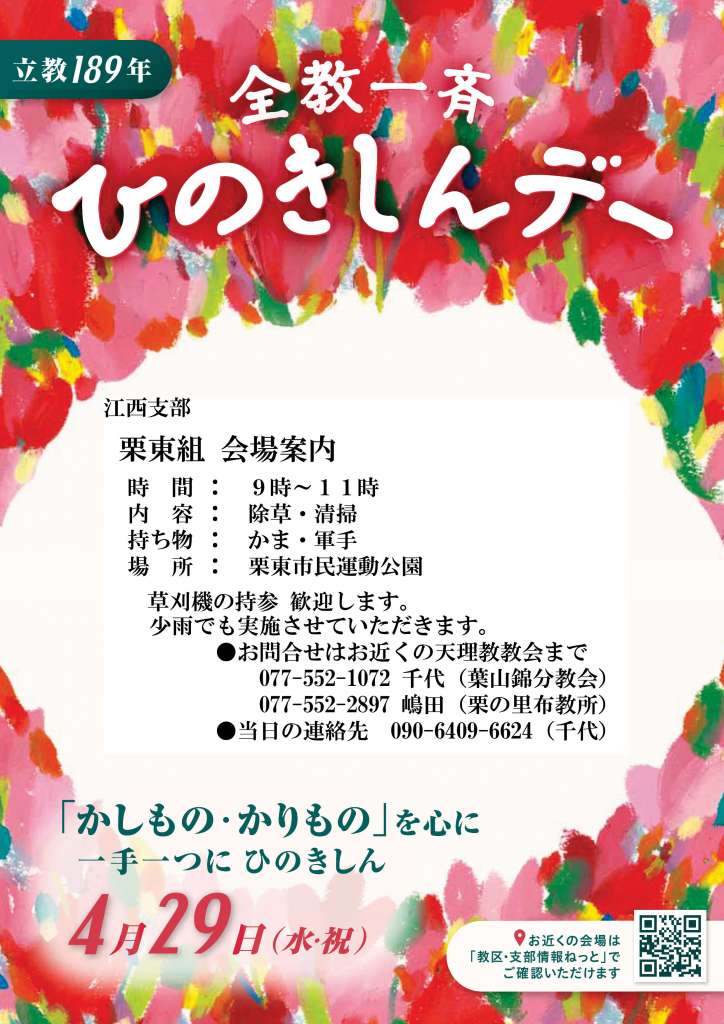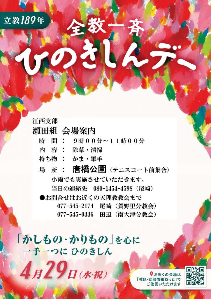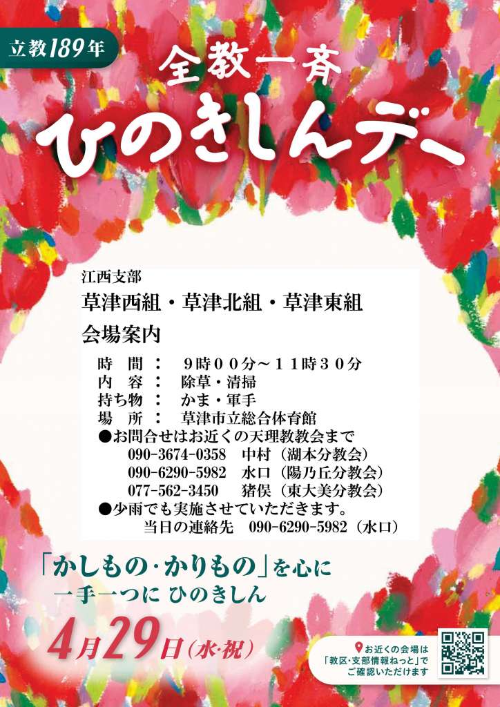 江西支部 掲示板 立教189年全教一斉ひのきしんデー 詳細情報 2026年03月04日 (水) 【江西支部】 4月29日の「全教一斉ひのきしんデー」各会場の詳細です。お一人でも多くのご参加をお待ちしております。▽瀬田会場 ▽栗東会場 ▽草津会場 ▽守山会場 ▽野洲会場 Tweet < 前の記事 OLD支部報 立教189年3月号