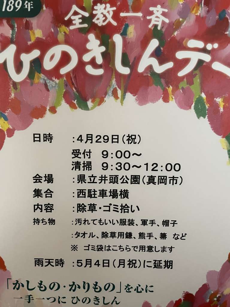 中央支部 掲示板 【中央支部】全教一斉ひのきしんデーについて 2026年04月07日 (火) 【中央支部】 日時 :4月29日(祝)雨天時:5月4日(月祝)に延期受 付:9:00~清 掃:9:30~12:00会 場:県立井頭公園(真岡市)集 合:西駐車場横内 容:除草・ゴミ拾い持ち物:汚れてもいい服装、軍手、帽子 :タオル、除草用録、熊手、箒など※ ゴミ袋はこちらで用意します Tweet < 前の記事 OLD第5回「ようぼく一斉活動日」を開催いたしました