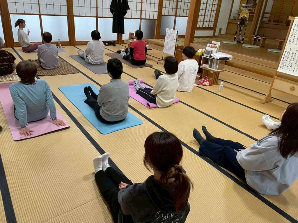 参加者一同でおつとめをさせていただき、その後 特別講習として講師をお招きしてヨガを体験しました。体を自由に使わせていただけることにあらためて感謝できました 雨の中、12人の参加者で和やかにできました!