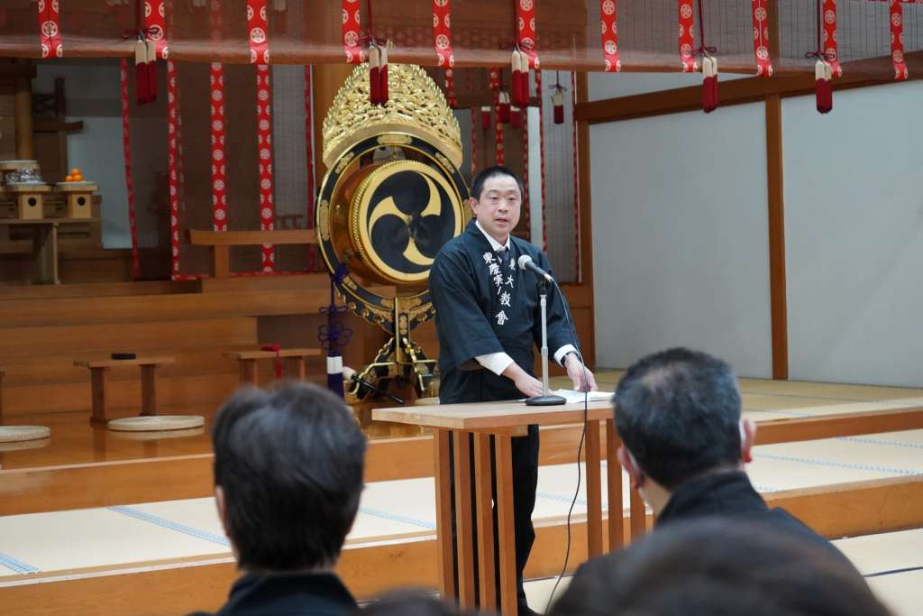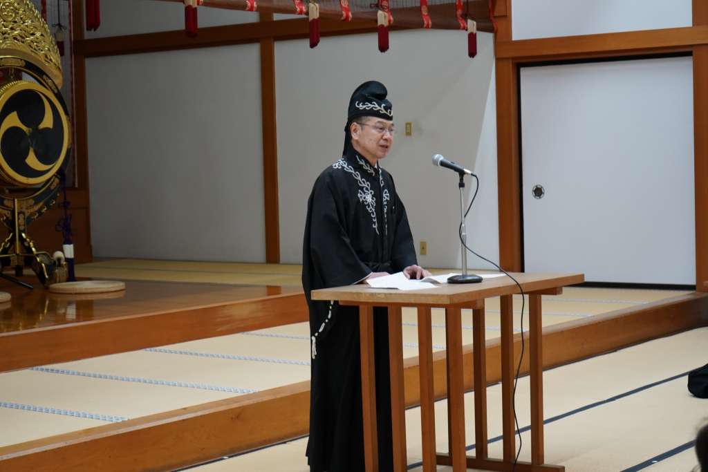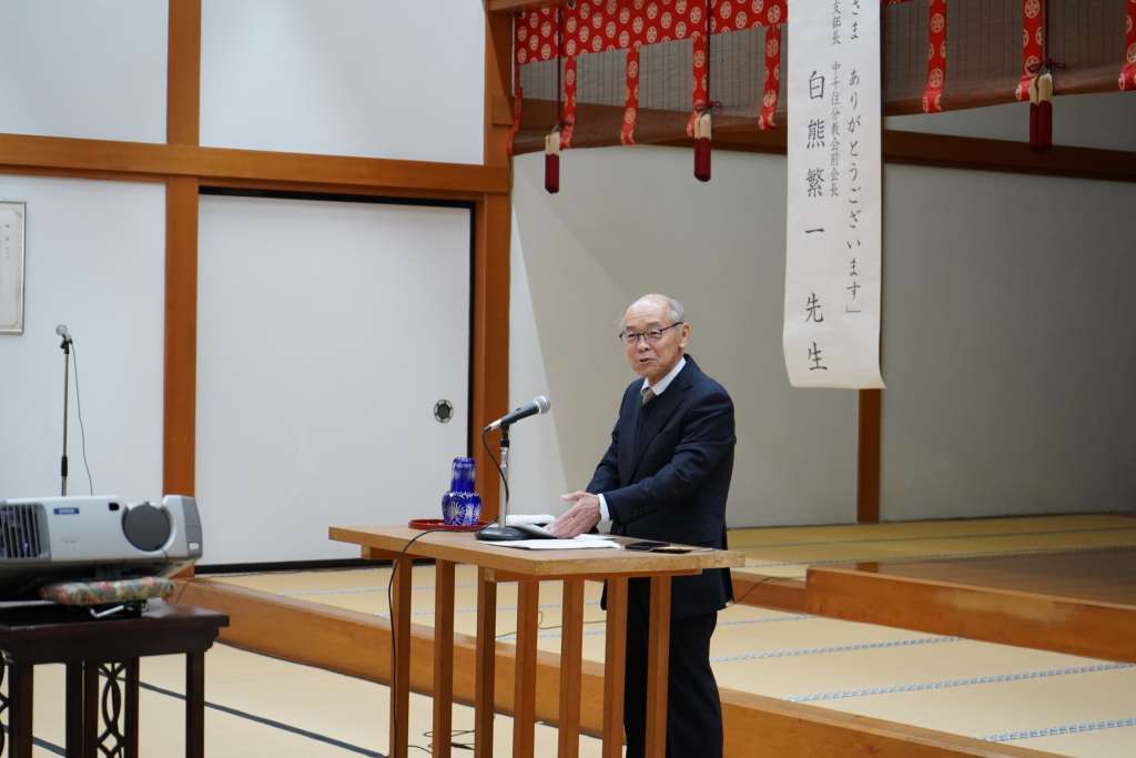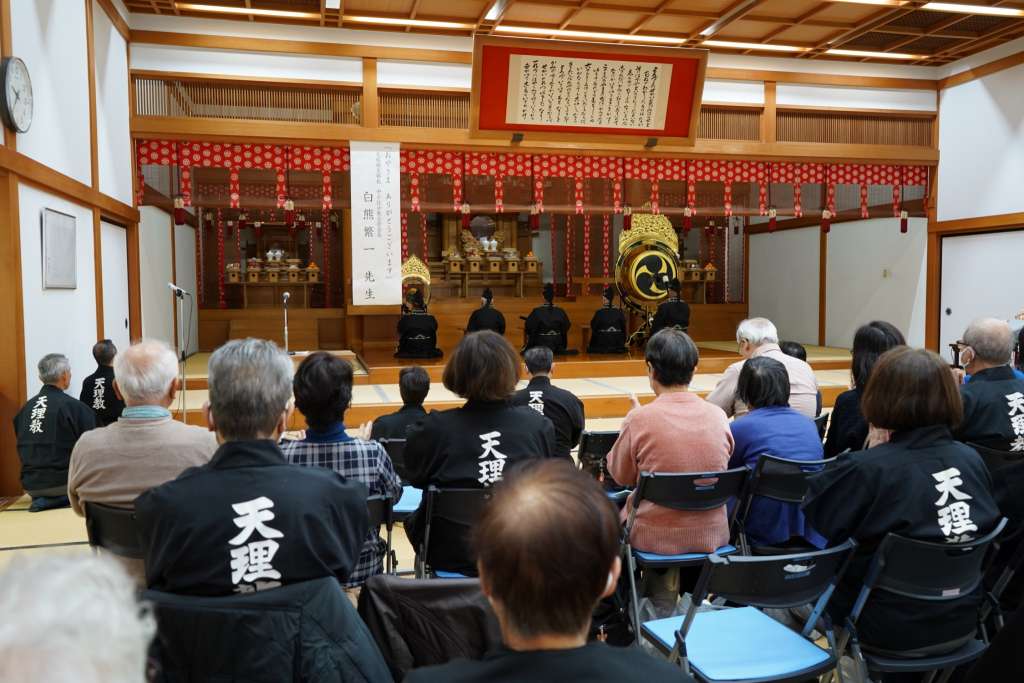 関根支部長の開講挨拶に始まり・座りづとめ・諭達第4号拝読・ご本部メッセージビデオ視聴の後、自主プログラムとして、「おやさま ありがとうございます」と題し、白熊繁一講師の講話を拝聴した。