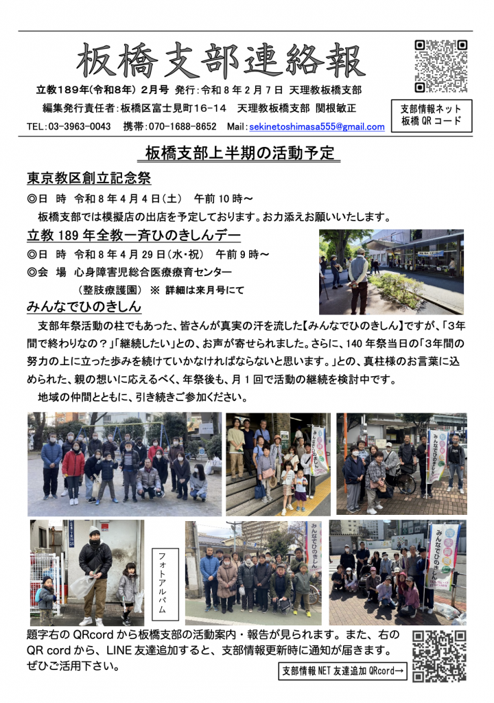 板橋支部 掲示板 令和8年2月号 2026年02月08日 (日) 【板橋支部】支部報 令和8年2月号 Tweet < 前の記事 OLD婦人会 活動報告 NEXT 次の記事 >板橋支部 新春おつとめ総会 開催報告