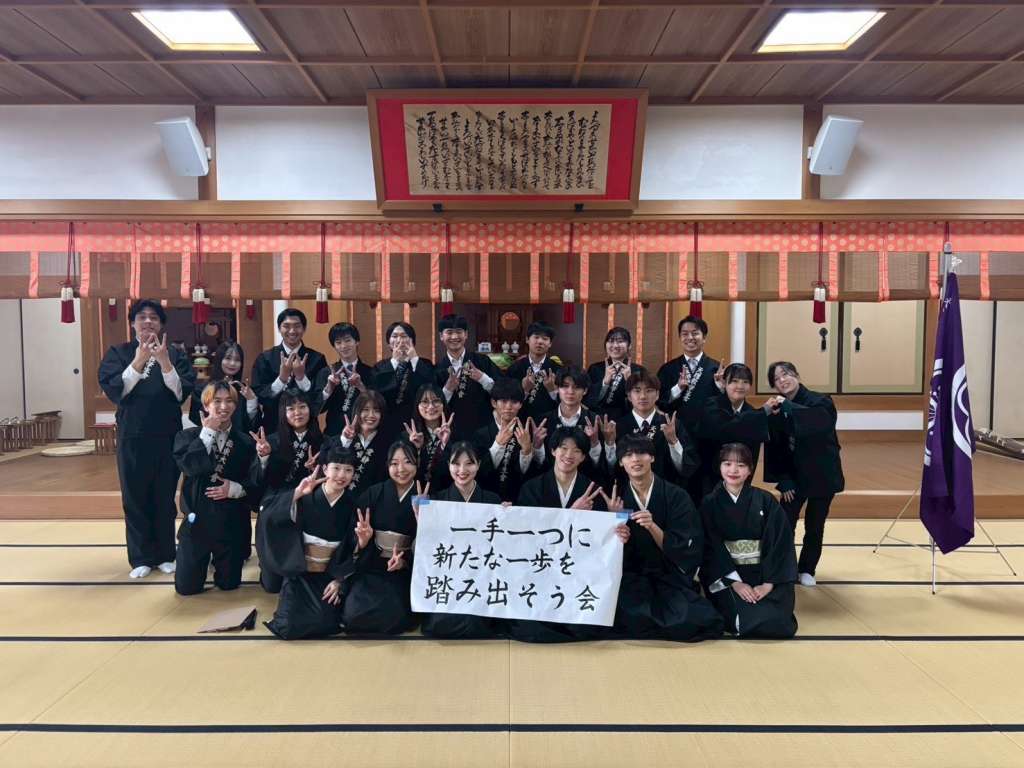 今回、みんなで心をあわせ、これまで第62期和歌山教区学生会が無事に通らせていだだけた感謝と、これからの学生会活動にみんなで一歩ずつ、力強く進んで行こうという決意を込めて「一手一つに新たな一歩を踏み出そう会」というテーマを掲げ、陽気に座りづとめ、手おどりをつとめさせて頂きました。